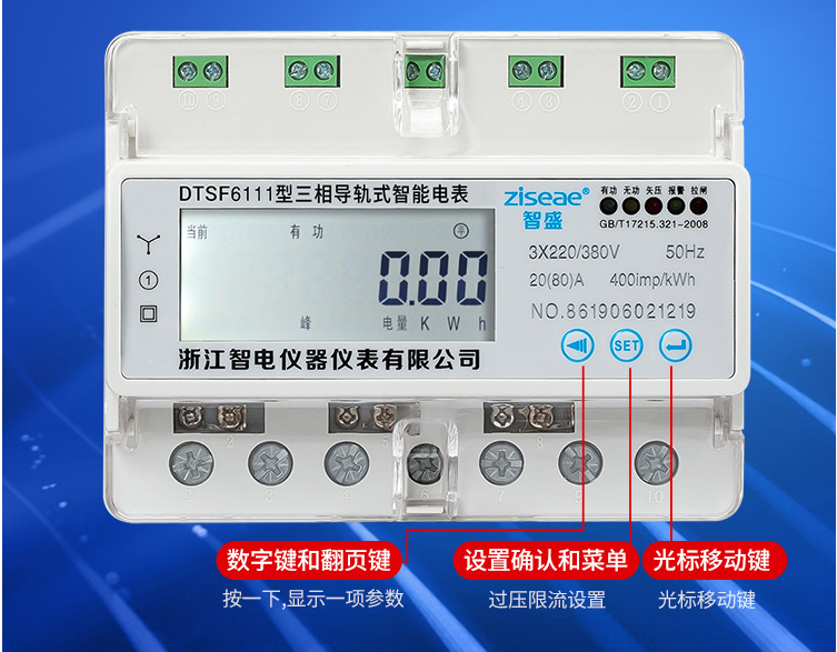 三相導軌式多費率電能表DTSF6111-7系我公司采用微電子技術計量電能,采用進口集成電路,應用數字采樣處理技術及SMT工藝等先進技術研制開發的電子式電能表。能直測量電能計量中正向有功電能,7LCD顯示器顯示有功用電量,具有可靠性好、體積小、重量輕、外表美觀、工藝先進、35mmDIN標準導軌式安裝等特點:并具有良好的抗電磁干擾、低自耗節電、精度高、高過載、穩定性強、防竊電、壽命長,液晶屏幕上可顯示當前總電量,無功電量,尖峰平谷的電量,電流,電壓,功率,功率因素,頻率,支持RS485 DL/645--2007或MODBUS通訊規約。